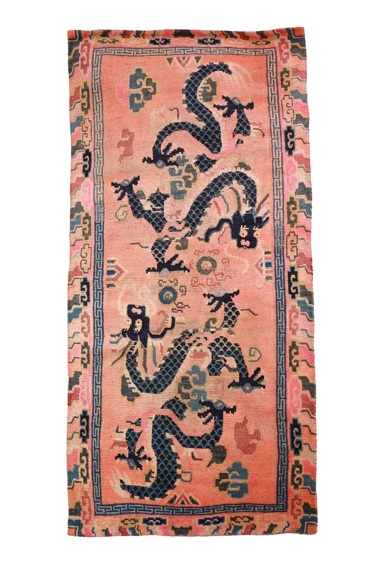 This hand-knotted Tibetan rug from the early 20th century (c. 1900) showcases two powerful dragons in dynamic, sinuous motion, soaring through stylized clouds in pursuit of flaming jewels—symbols of enlightenment, spiritual wisdom, and truth. Each dragon clasps a flaming pearl in its raised foreleg, with closed claws symbolizing mastery and the protection of sacred power.