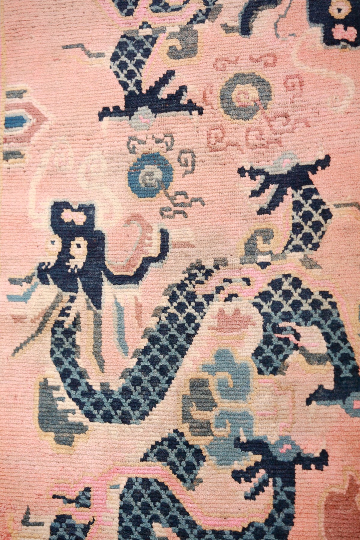 The dragons are rendered in vivid detail: large expressive heads, manes, thick curling tails, bulging eyes, arched horns, flowing whiskers, and open, snarling mouths—evoking their mythic presence. Their finely articulated scales reflect the exceptional craftsmanship of the weaver. The clouds encircling them echo the aesthetic of Qing dynasty silk textiles, enhancing the rug’s imperial elegance.