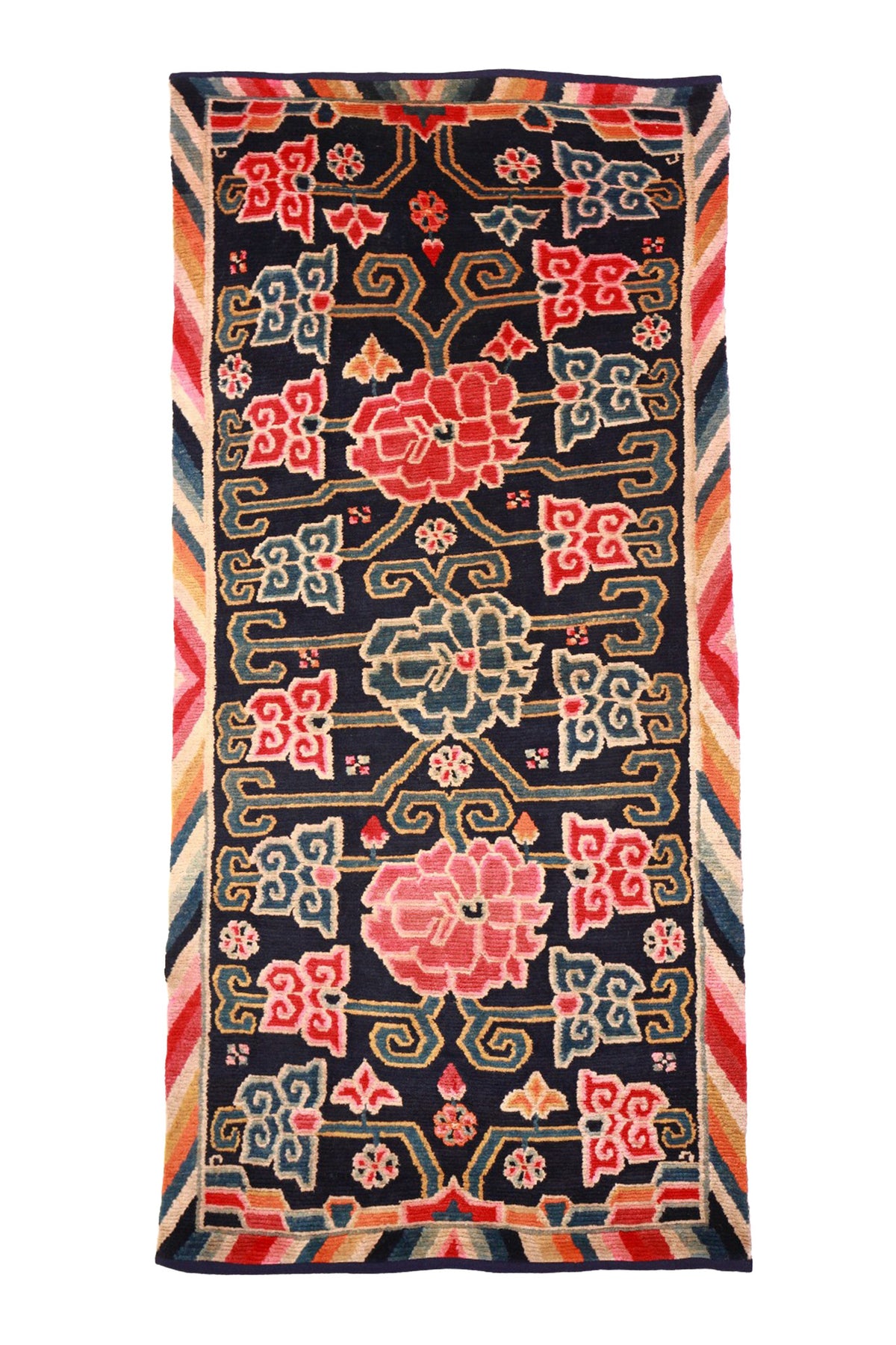 This early 20th-century Tibetan rug, set on a deep indigo-blue field, is handwoven with lustrous, soft sheep wool from the Tibetan Plateau. At its centre, three large lotus flowers bloom in a row—the middle one featuring a distinct colour palette, setting it apart from the flanking blooms.