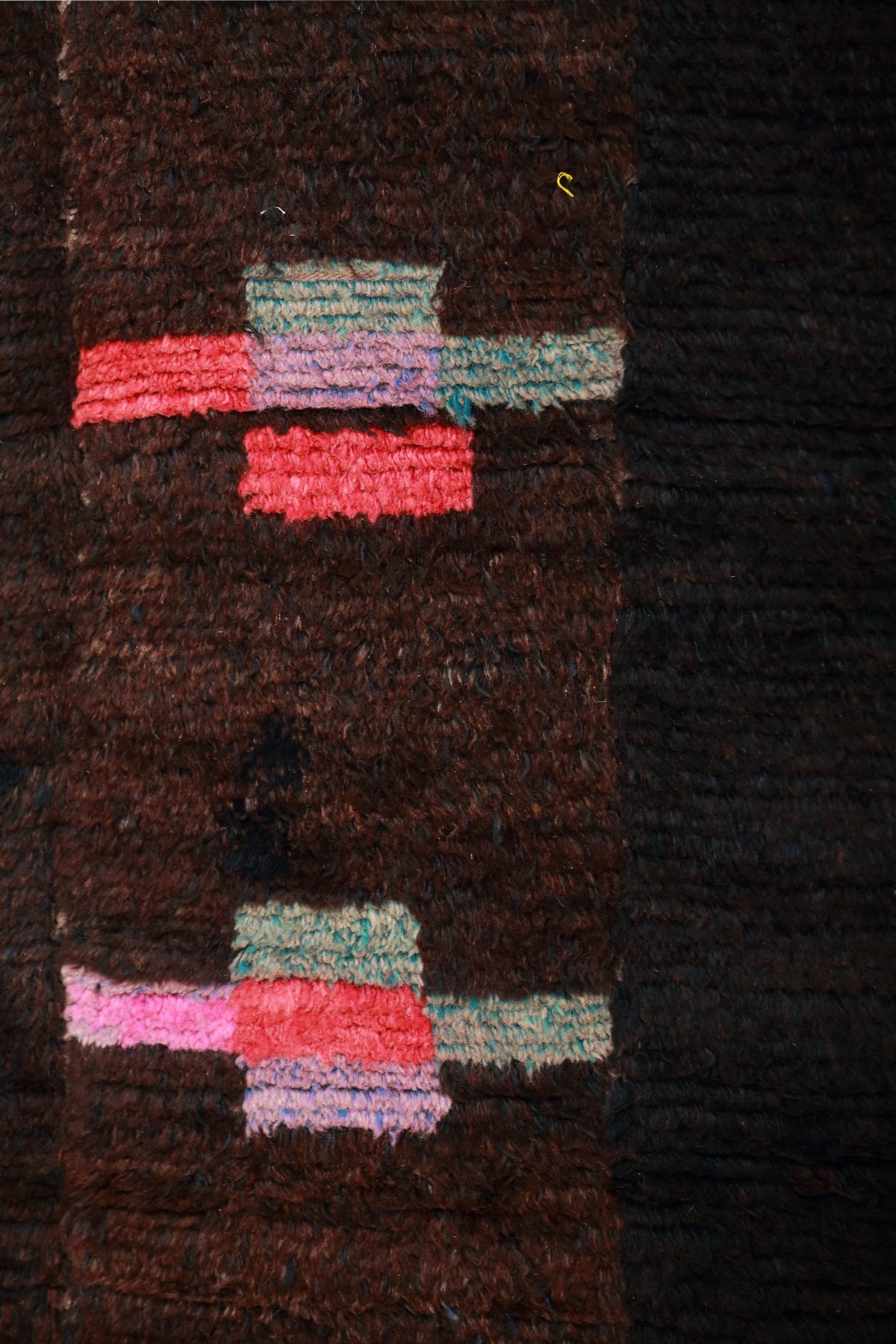 The central field is composed of deep brown-indigo-black  tones, creating a dramatic visual contrast with the vibrant, symmetrically arranged motifs that run through the middle. Dominating this central axis are bold, geometric cross-like figures—ancient Tibetan symbols representing the four cardinal directions and the centre, a powerful expression of cosmic harmony and spiritual protection. These motifs may also reference the vajra, the indestructible thunderbolt emblem in Tibetan Buddhism, symbolizing strength and clarity of mind.